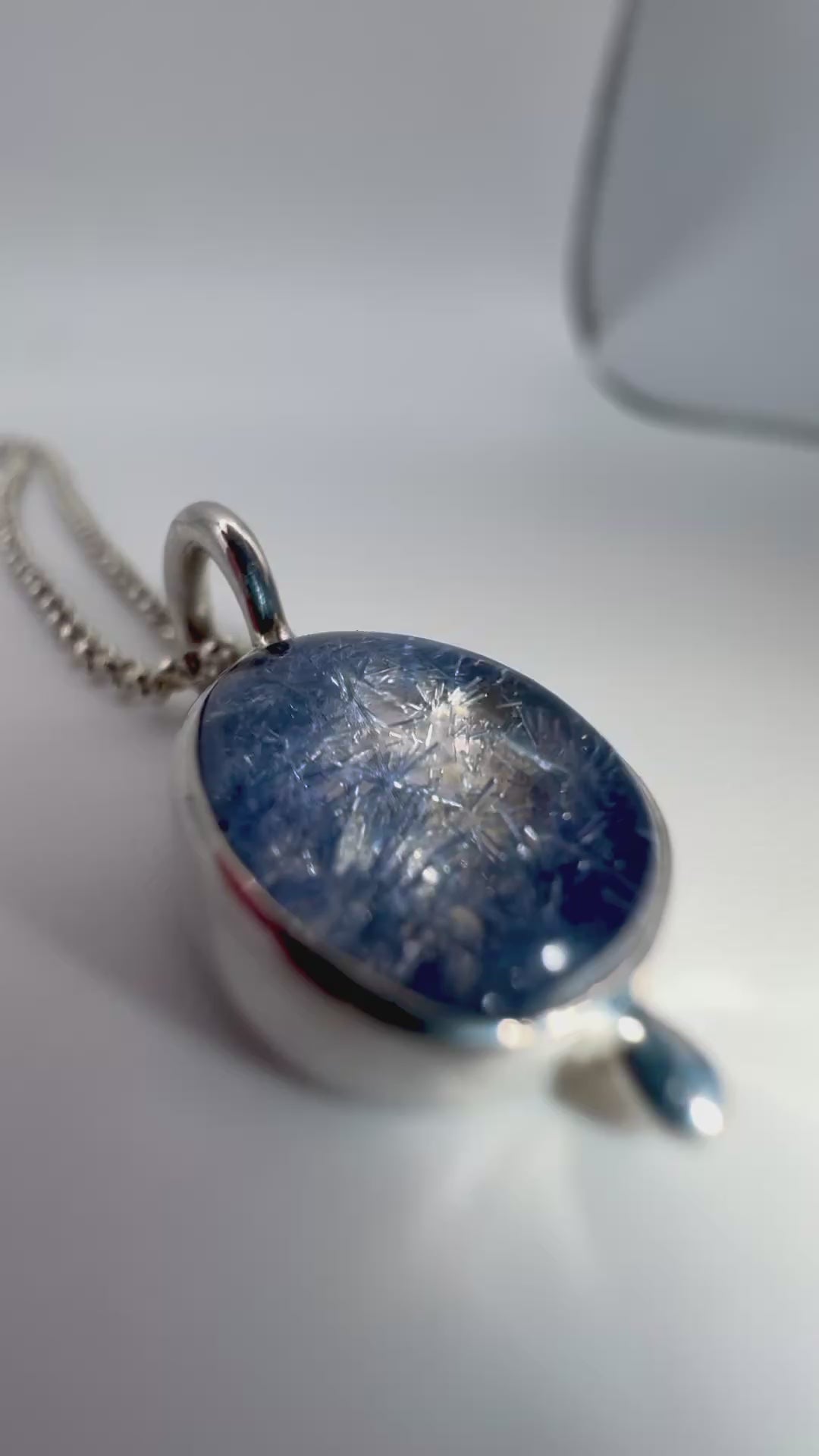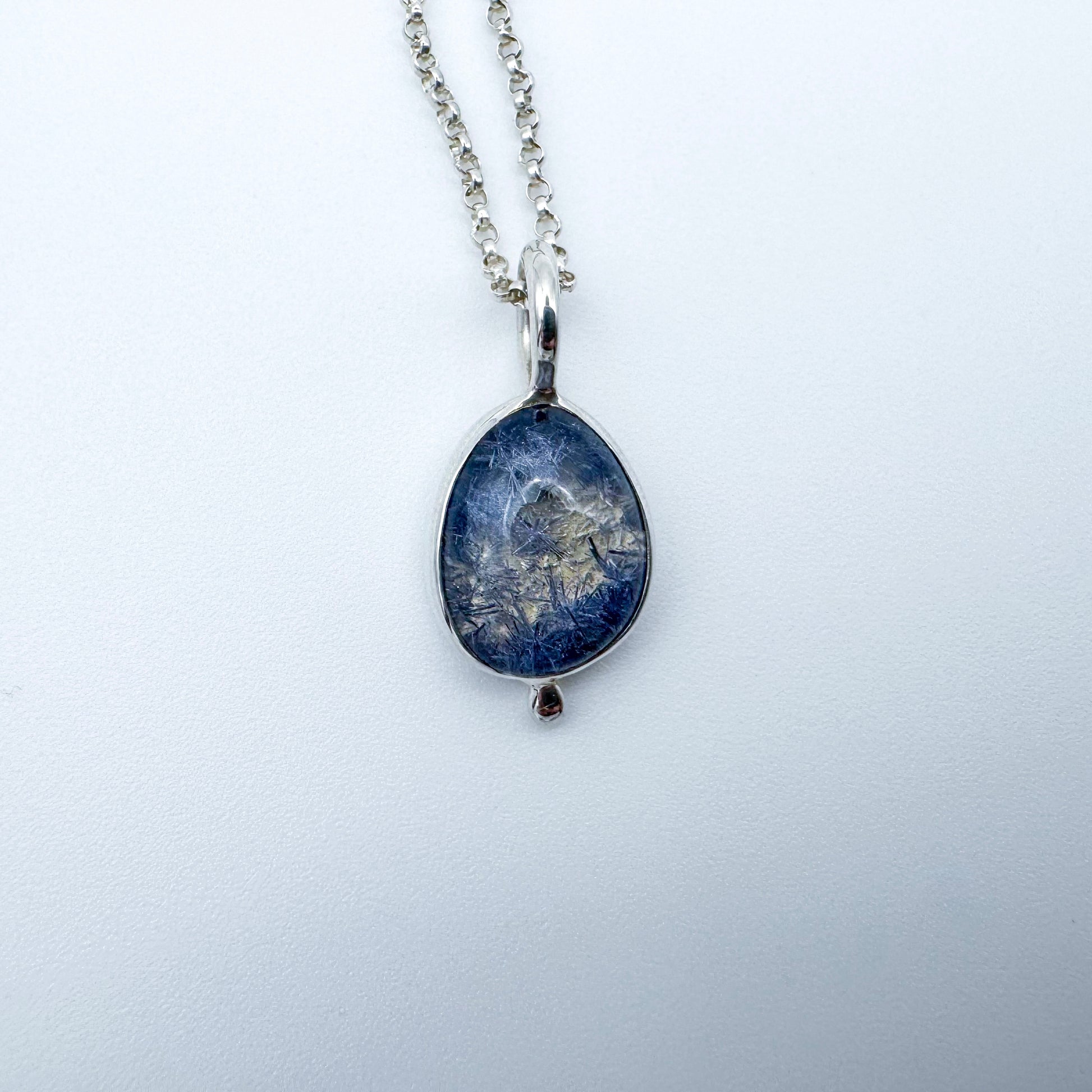 This handmade, solid .925 Sterling Silver pendant holds a natural, artisan cut Dumortierite in Quartz gemstone. I cut and polished this gemstone starting from a raw quartz crystal.