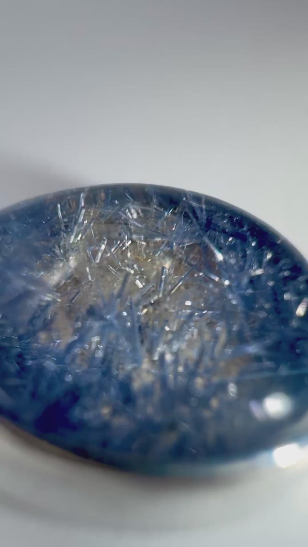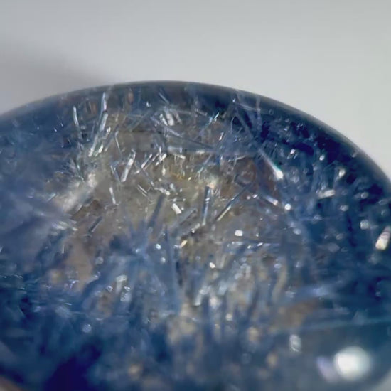 There are rutile fibrous inclusions of the mineral Dumortierite, inside of this quartz gemstone, which has prismatic crystals that catch the light, much like frost or ice crystals in the sun.
