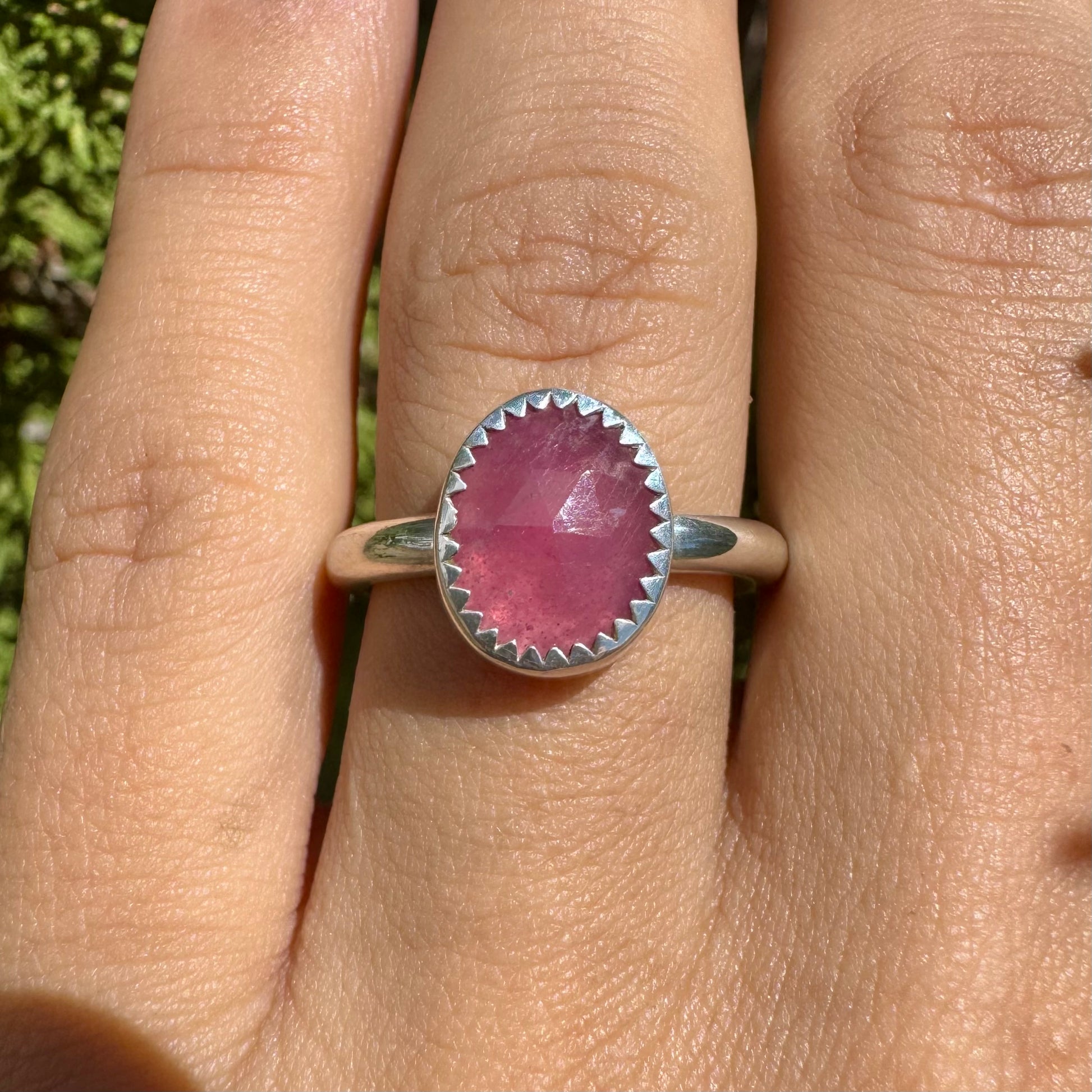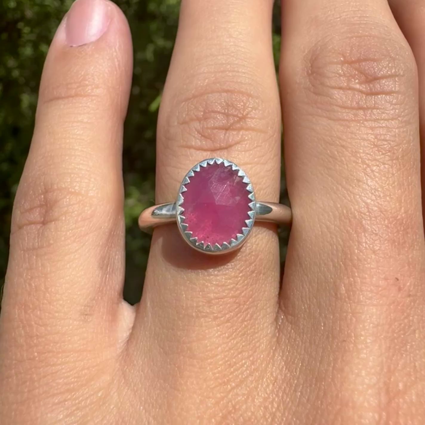 This handmade solid sterling silver ring holds a flashy rose-cut, lovely pink ruby.