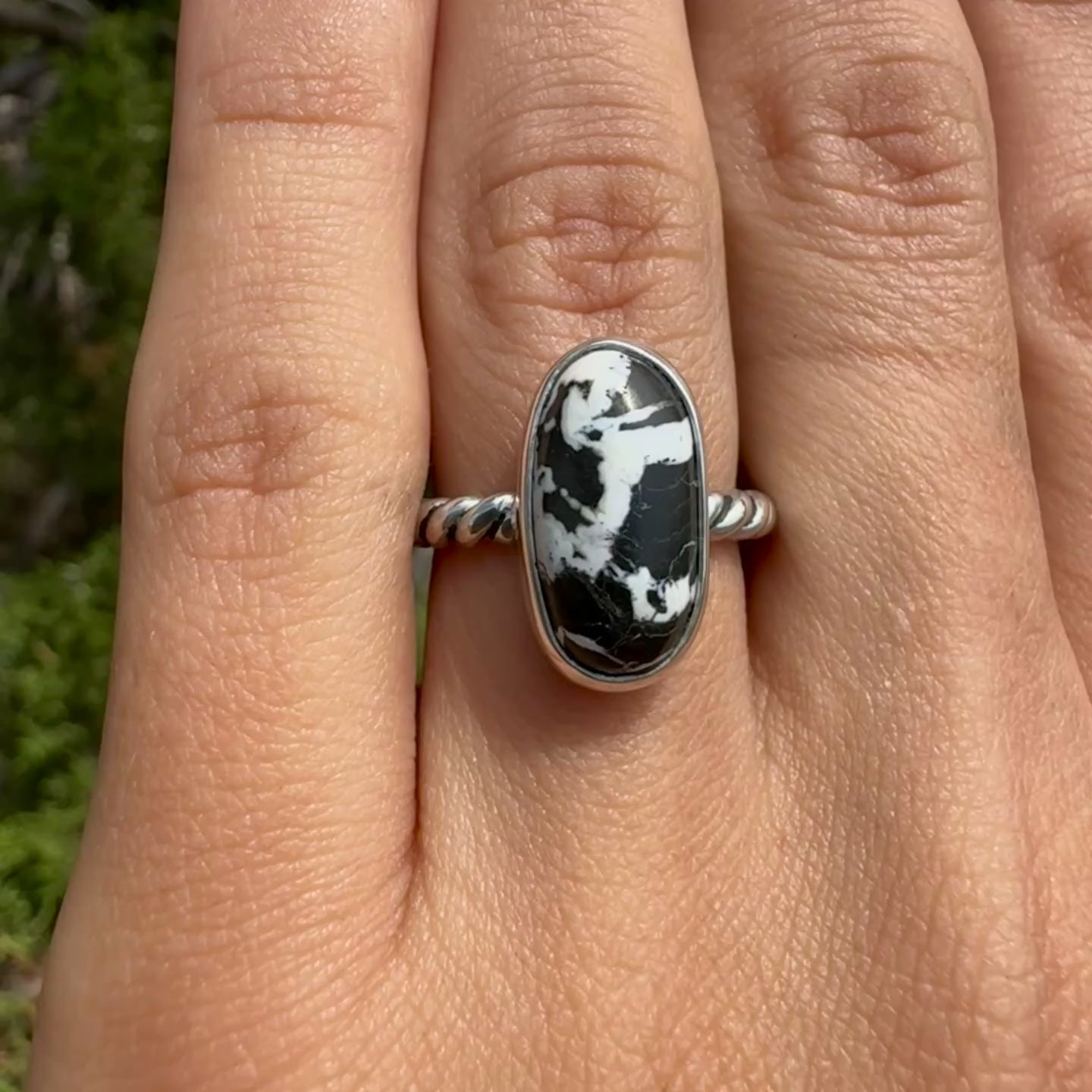 This handmade solid sterling silver statement ring holds an artisan cut White Buffalo gemstone on a twisted rope band.