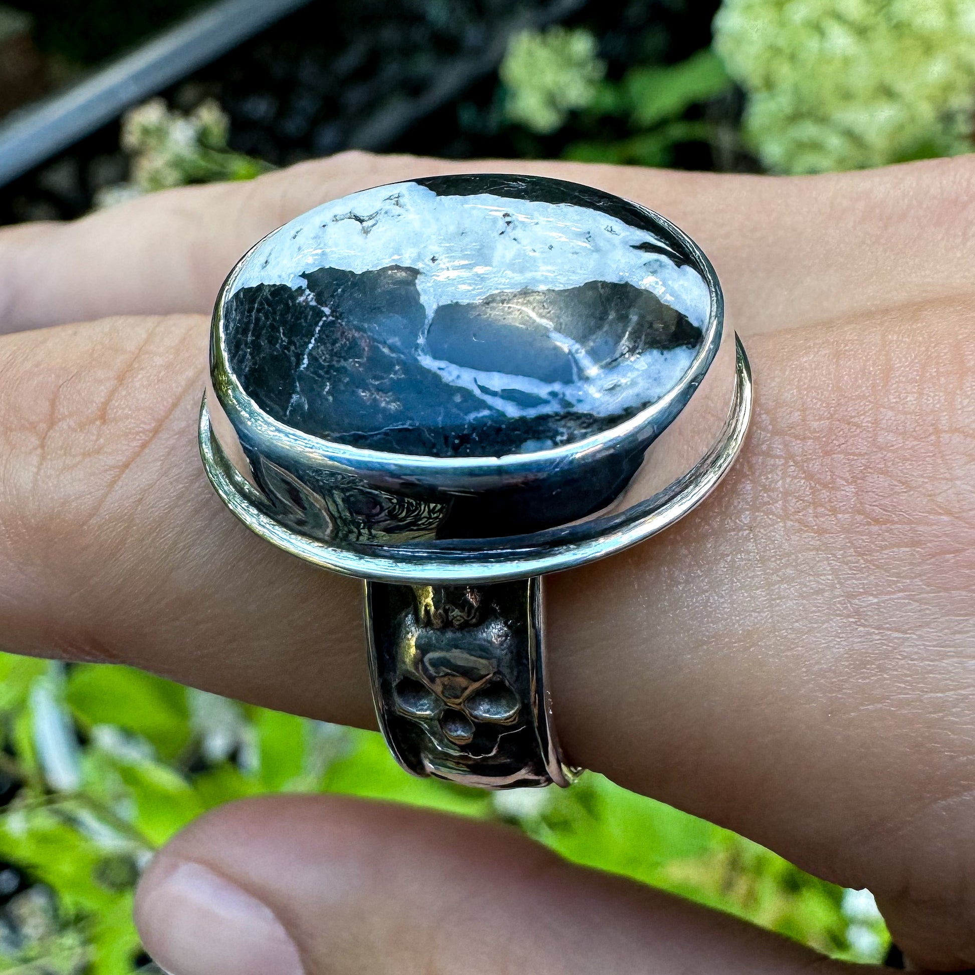 Handmade solid Sterling Silver ring, made with a large White Buffalo gemstone, and a hefty skull adorned ring band. Size 10.5